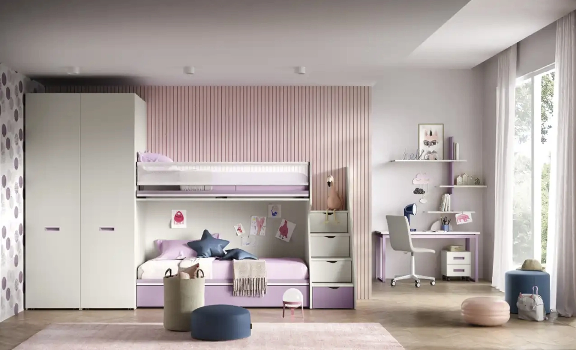 Con questa cameretta K103 Moretti Compact Camerette, tra le soluzioni a soppalco, potrai ammobiliare stanze moderne per bambine.